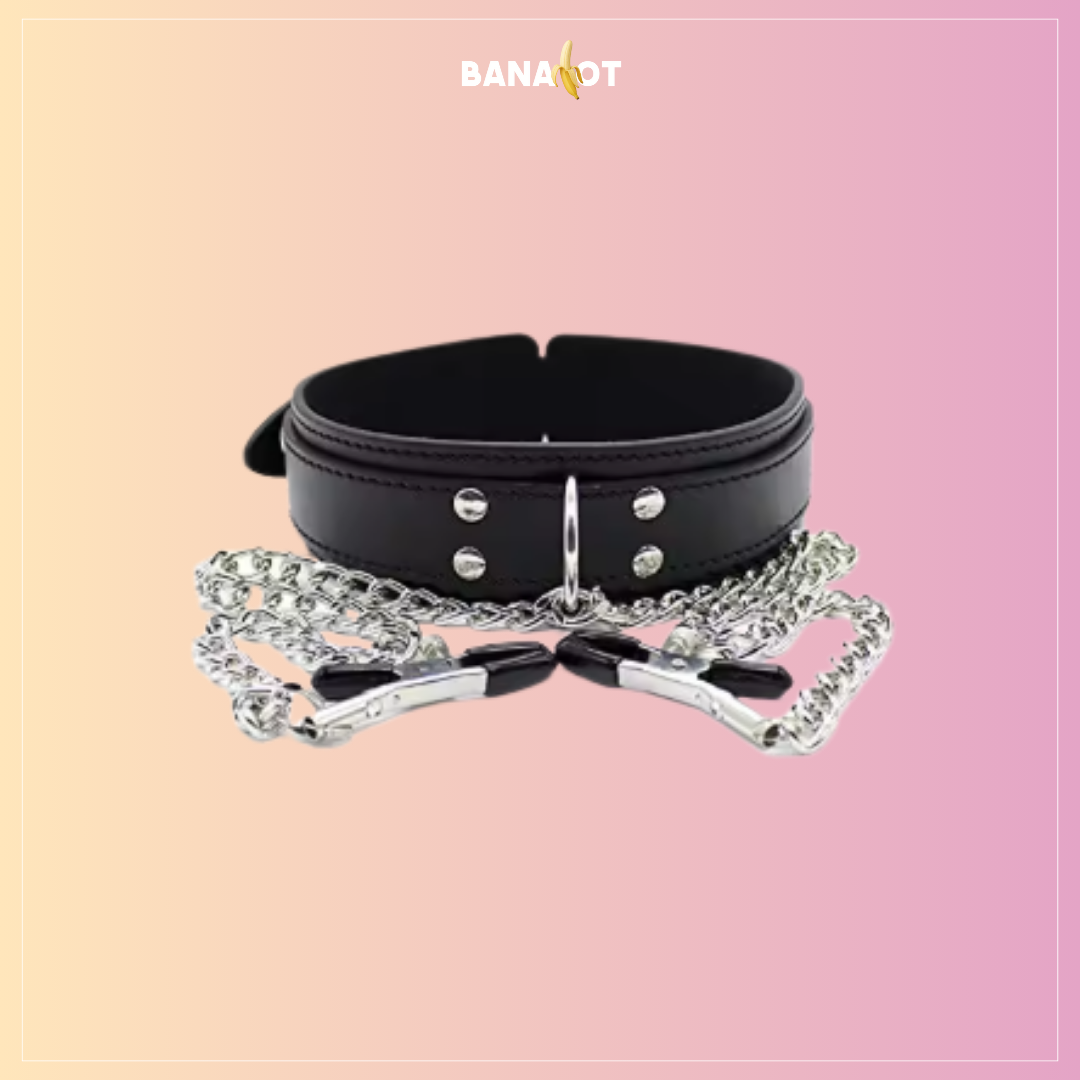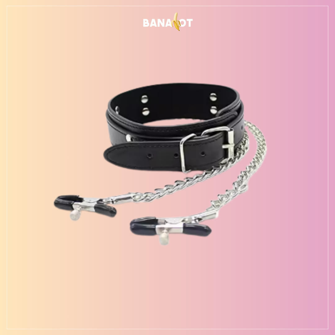 סט BDSM חושני – קולר עם שרשרת וקליפסים לפטמות